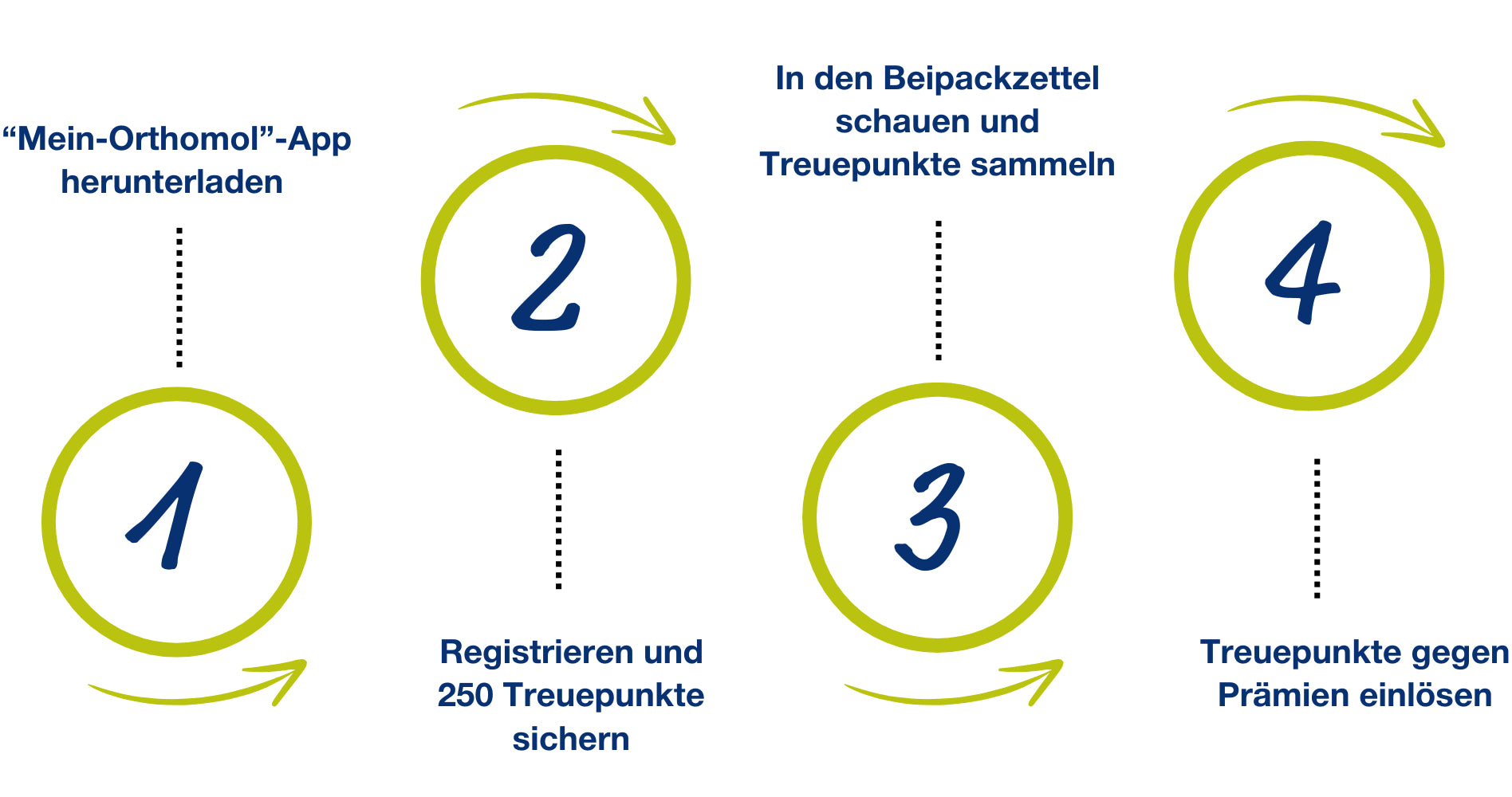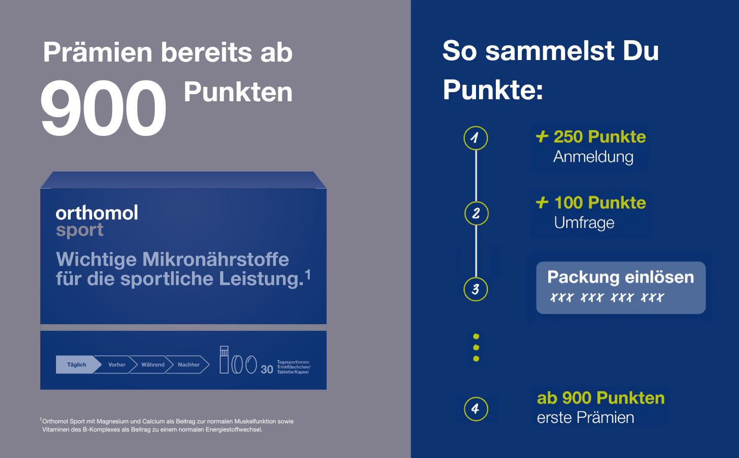 Für Deine Registrierung schreiben wir Dir direkt 250 Punkte gut, für die Registrierung einer Orthomol Monatspackung bekommst Du 300 Punkte. Deine gesammelten Treuepunkte löst Du gegen Orthomol-Produkte Deiner Wahl ein – und das bereits ab 900 Punkten.