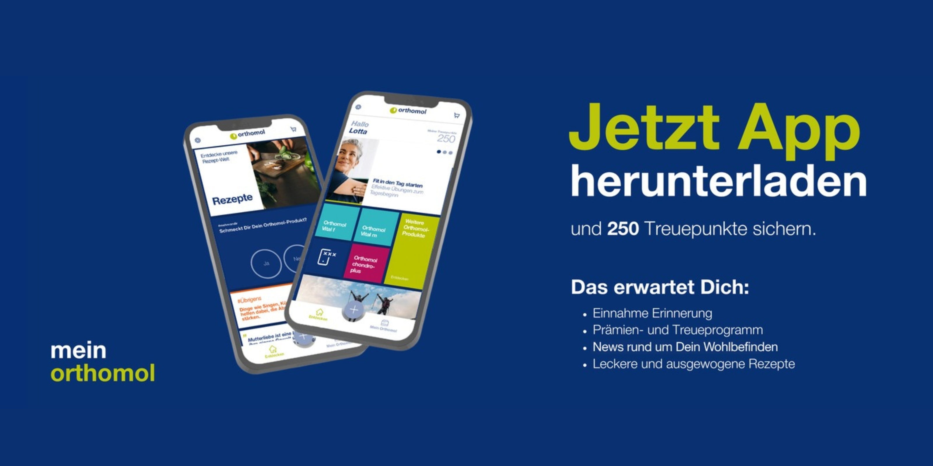 Lade Dir jetzt die „Mein Orthomol”-App herunter, sichere Dir 250 Treuepunkte und lasse Deine Treue belohnen.